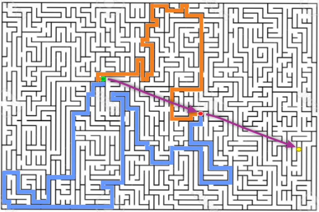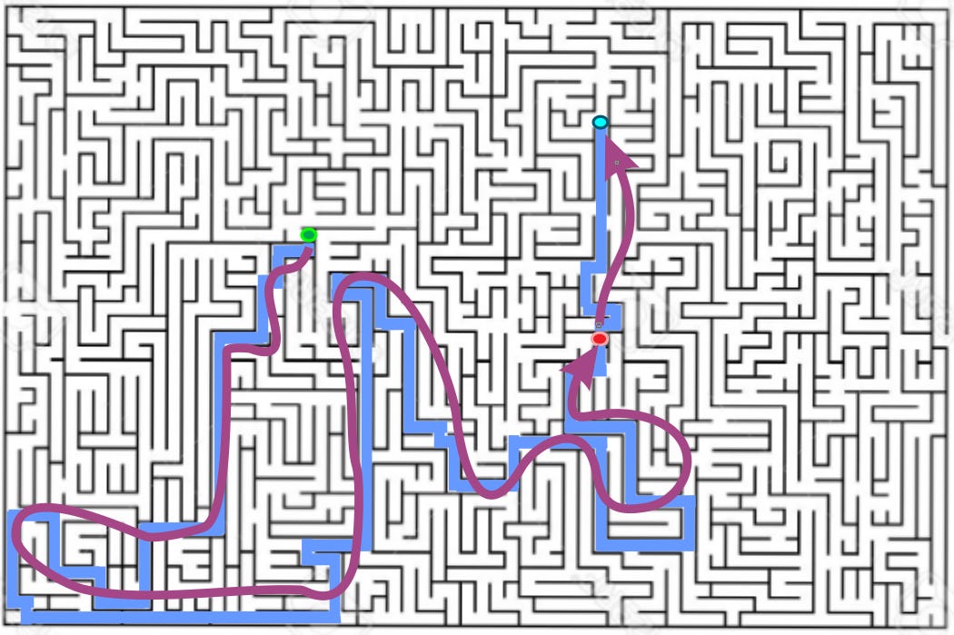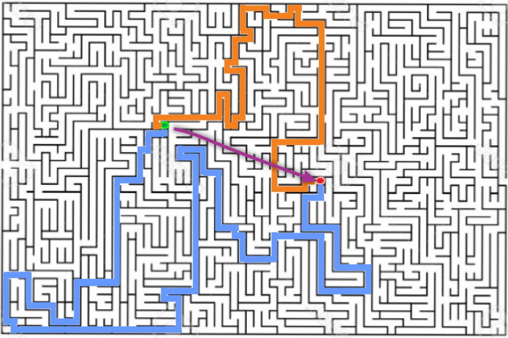 Consider the two points on the maze - the starting green point, and the ending red point. Now see how there are at least two paths that lead between the two - the top path that is shown in orange, and the bottom path shown in blue. There are likely many other possible paths between the two points - some longer and some shorter, but we’ll just show these two for the purpose of this example.